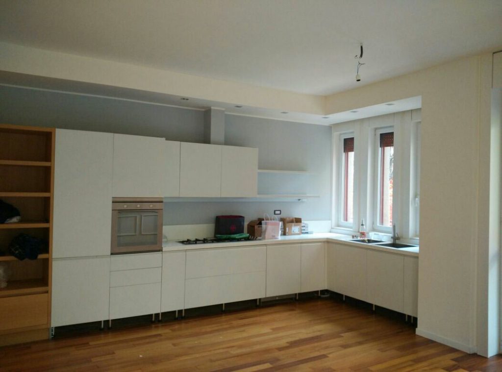 Abbiamo seguito la ristrutturazione di un appartamento a Milano zona Fiera, sui pavimenti abbiamo posato un parquet essenza iroko, alle pareti abbiamo realizzato una boiserie in gesso.