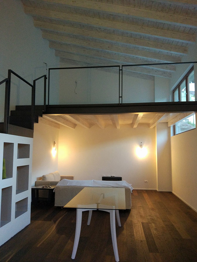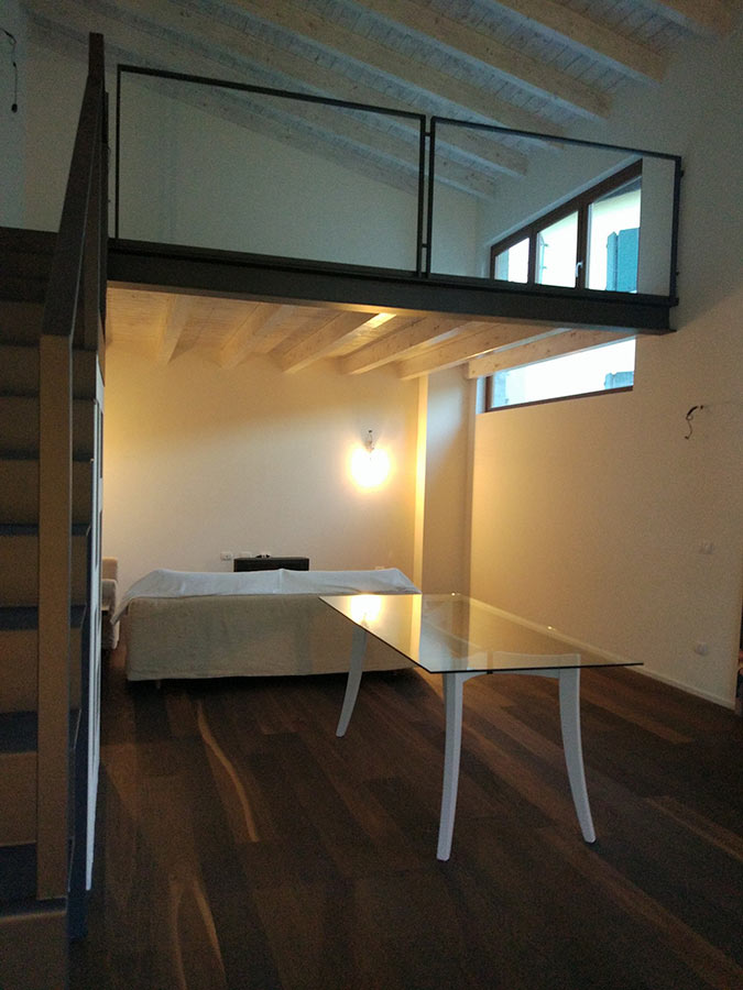 Il parquet scelto è spazzolato, oliato e termocotto, cioè scurito  con il calore per tutto lo spessore del legno.