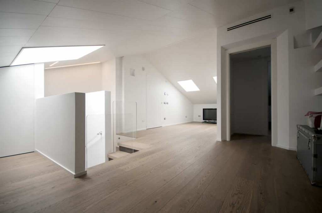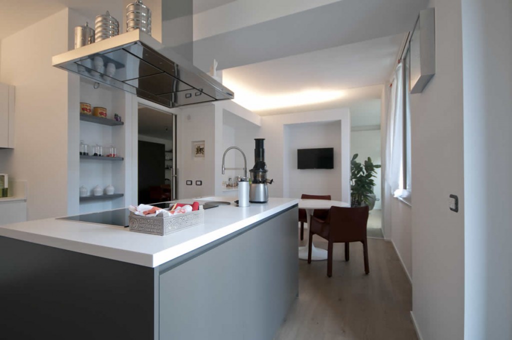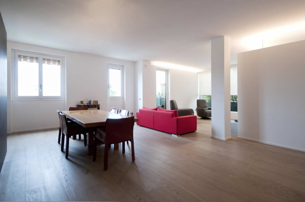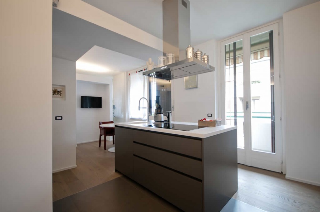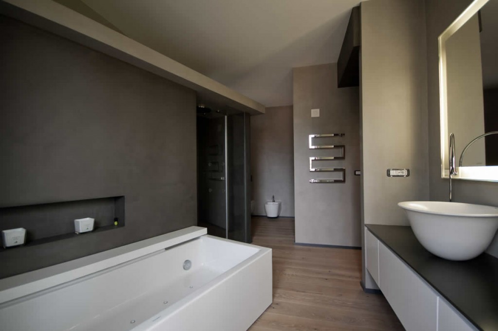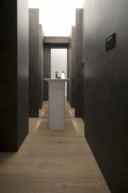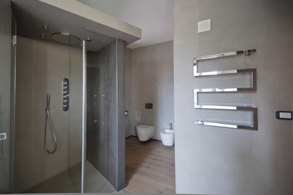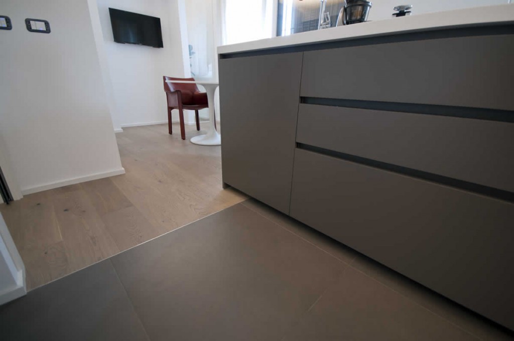 A Milano in un appartamento, abbiamo posato un un parquet in plancia spazzolata e oliata, abbiamo rivestito il bagno in micro cemento e inserito e nell’angolo cucina  il gres porcellanato.