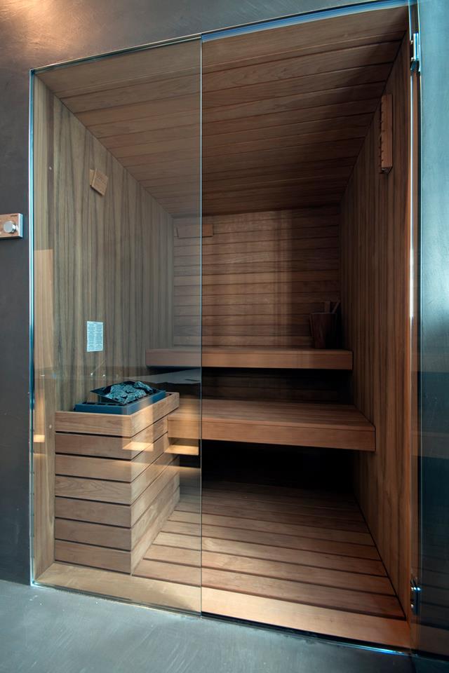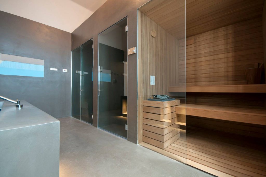 Abbiamo realizzato una pavimentazione in microcemento color grigio tortora che si combina con il legno utilizzato nella zona sauna.
