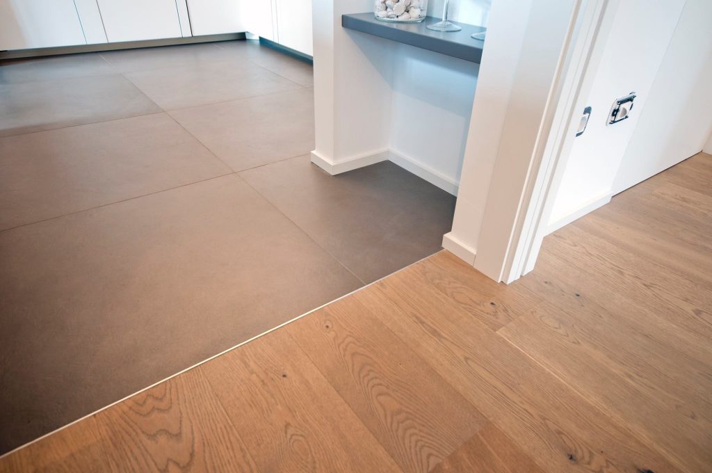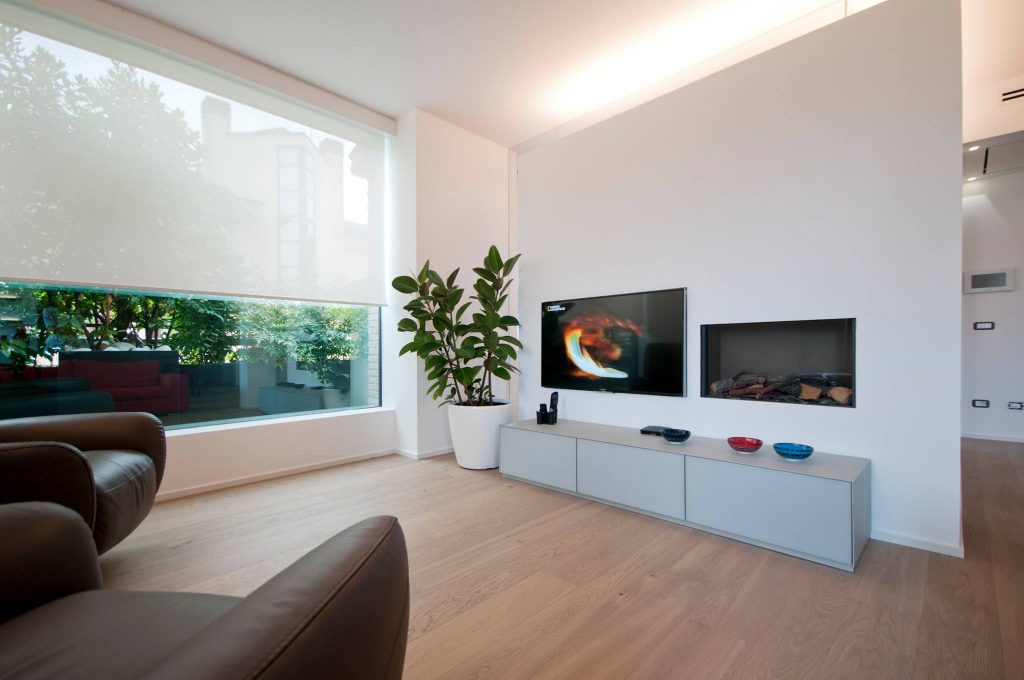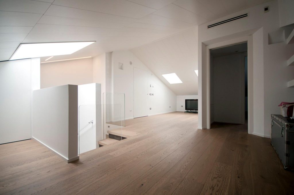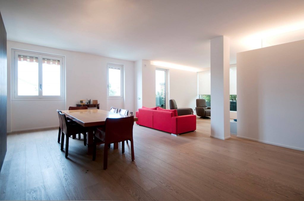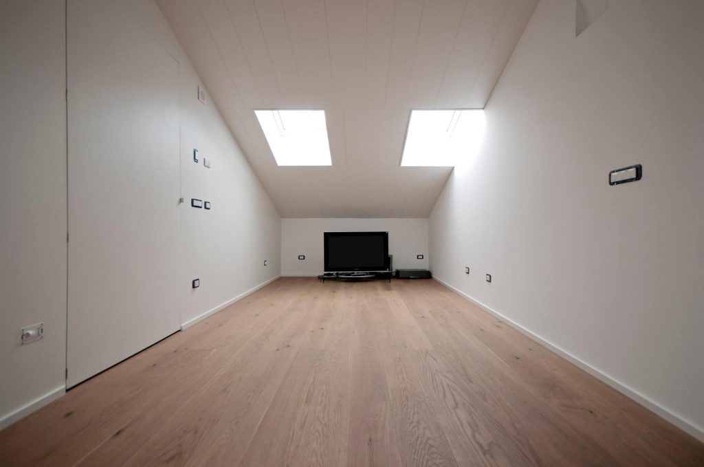Mantenendo lo stesso stile dei bagni, si è scelto un parquet in plancia spazzolata e oliata, per dare alla casa uno stile elegante e accogliente, consentendo una maggiore capacità di isolamento. Il parquet in plancia è costituito da più strati, viene spazzolato e oliato prima della posa in opera e non necessita della colla in quanto risulta più stabile rispetto a un parquet massello.