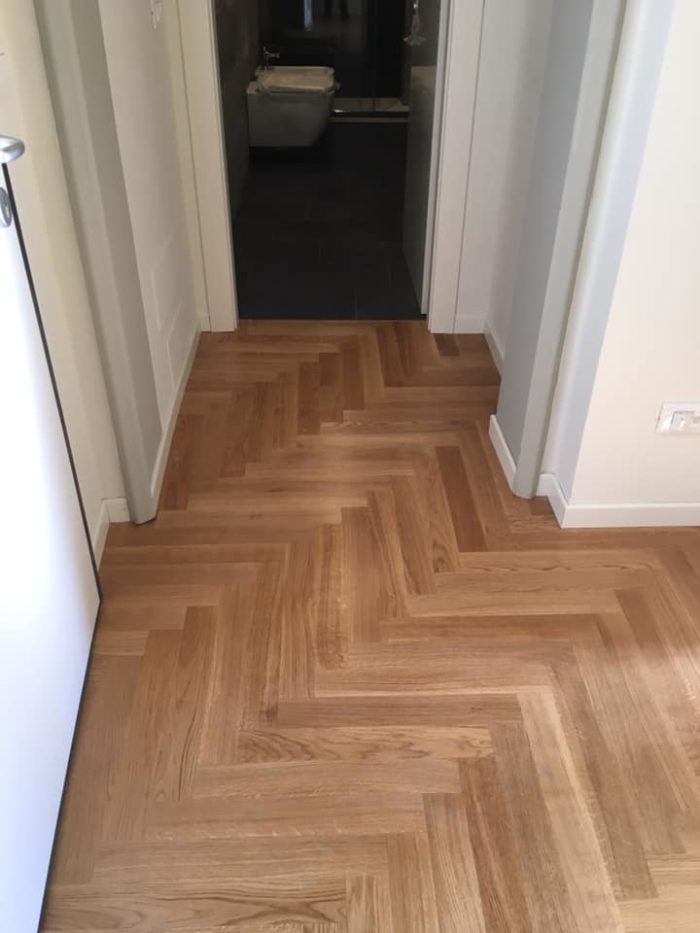 Il legno di rovere è elegante e resistente. Quando queste caratteristiche incontrano il parquet, allora, i locali di un’abitazione diventano calorosi e accoglienti più che mai. Abbiamo scelto la tonalità rovere 15 e il suo colore chiaro permette una lavorazione che offre una vasta gamma sfumature. Questo bellissimo parquet a spina richiama il classico parquet milanese.
