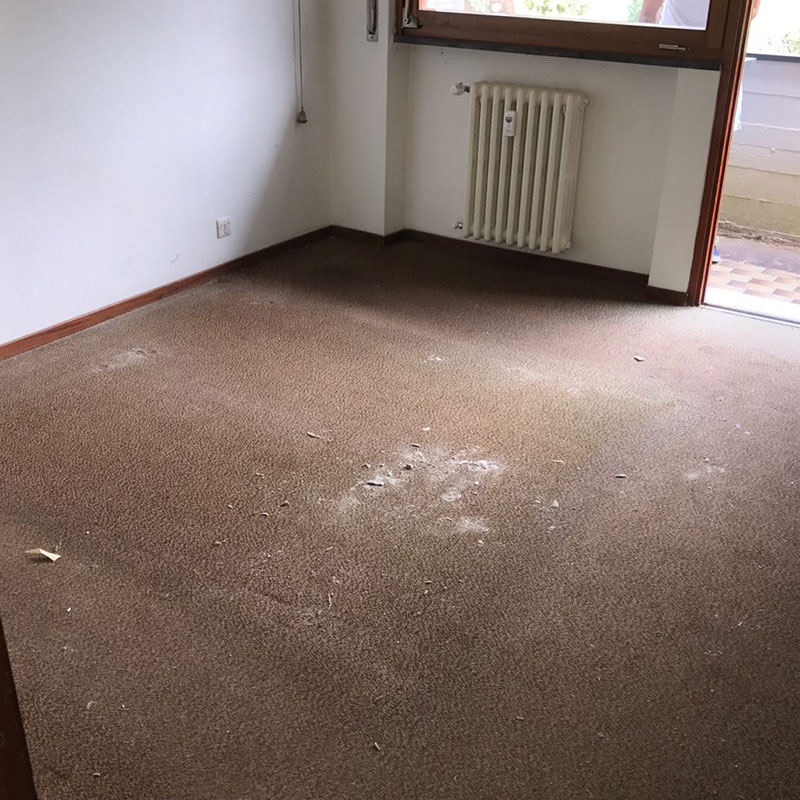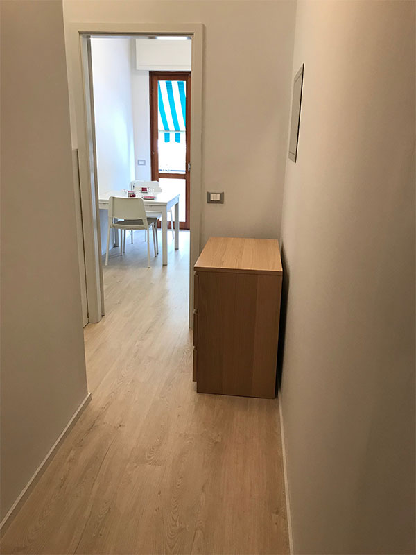 In tutto l’appartamento abbiamo posato sopra le vecchie piastrelle (senza rimuoverle) nostro pavimento in PVC effetto parquet rovere chiaro completo di zoccolino.